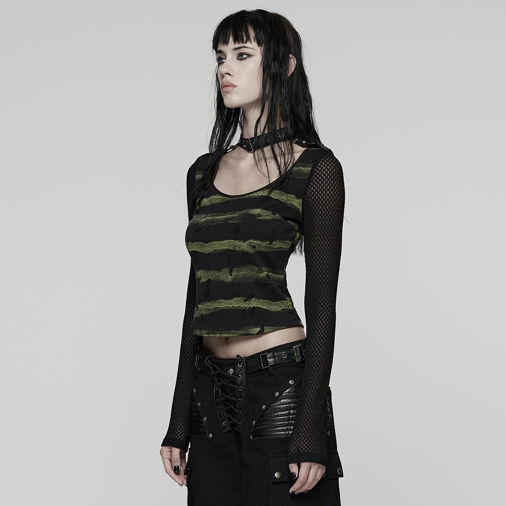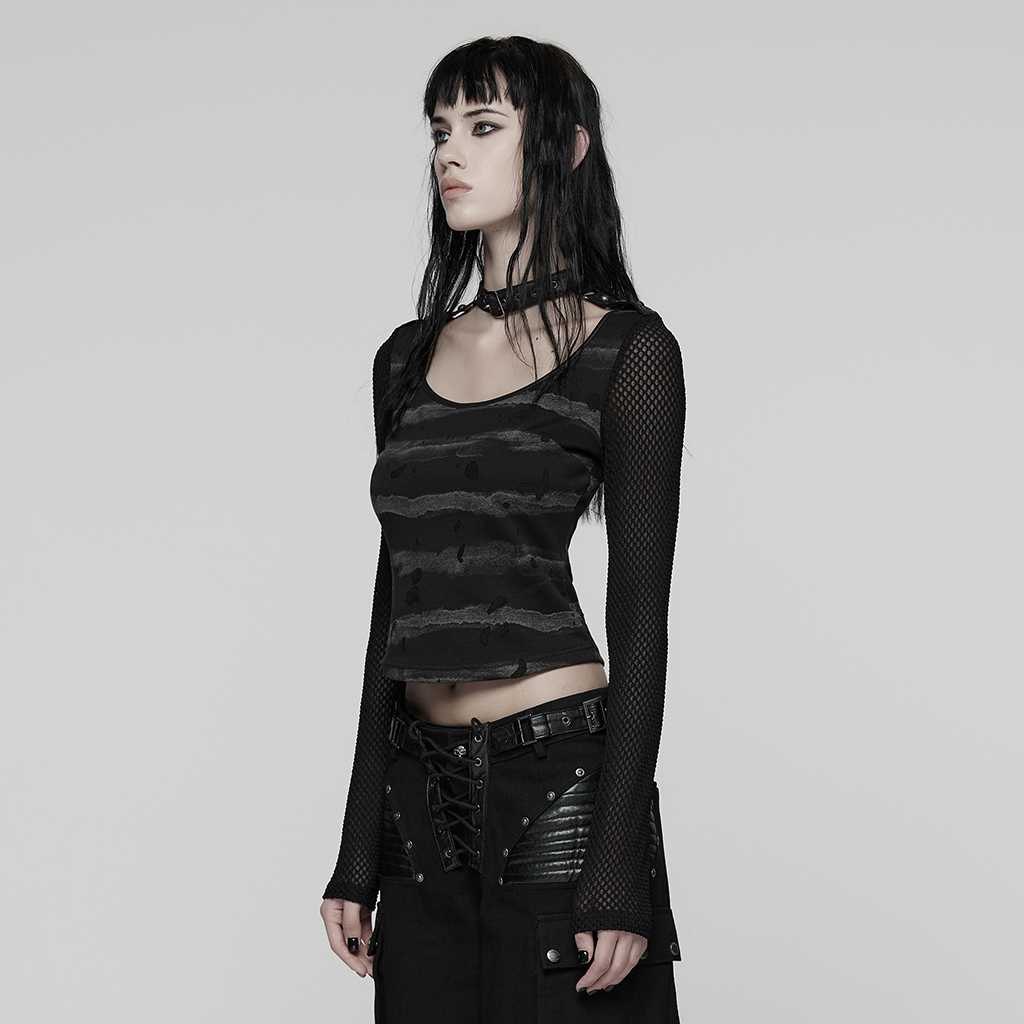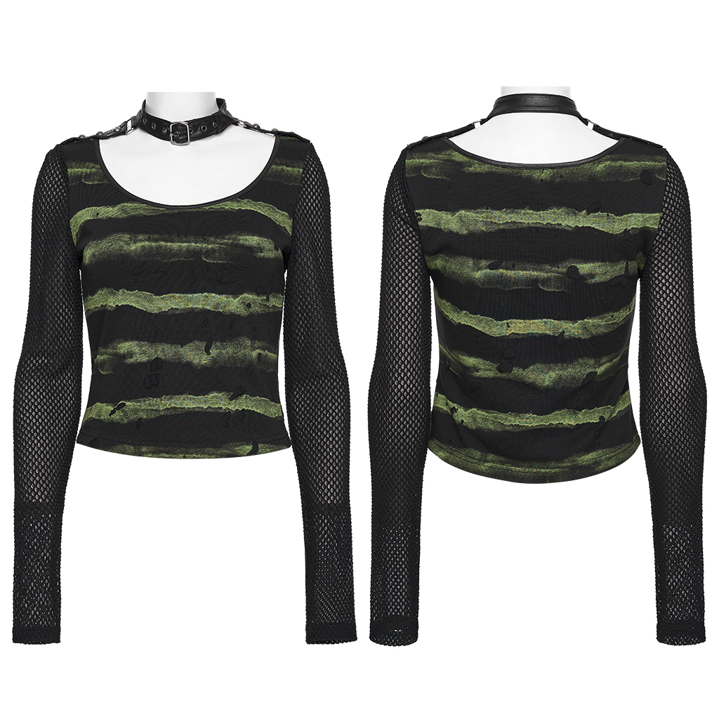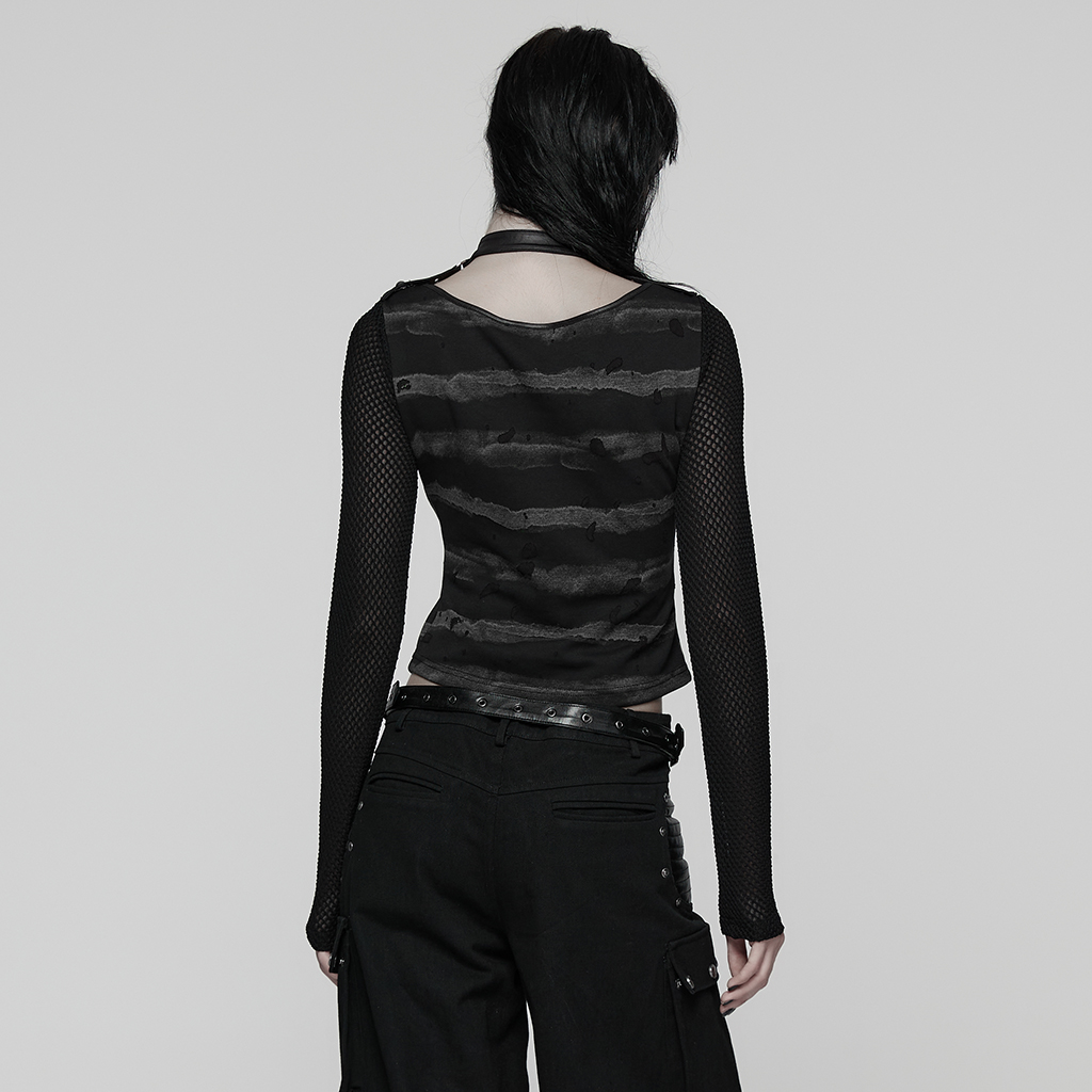 Made of stretch striped tattered knit fabric and mesh.