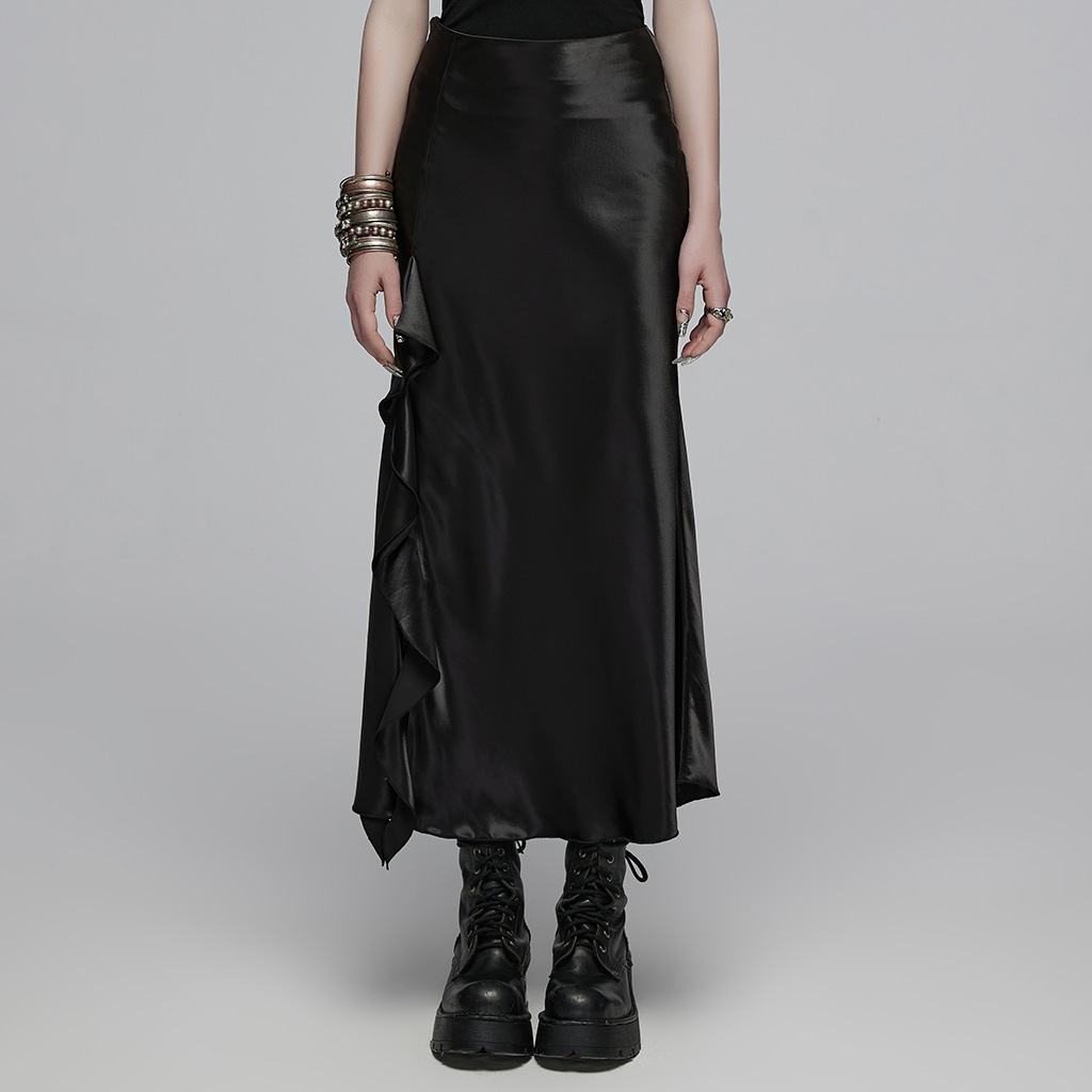 Fit A-line skirt ,asymmetric side split stitching with ruffled edges adds a feminine touch.