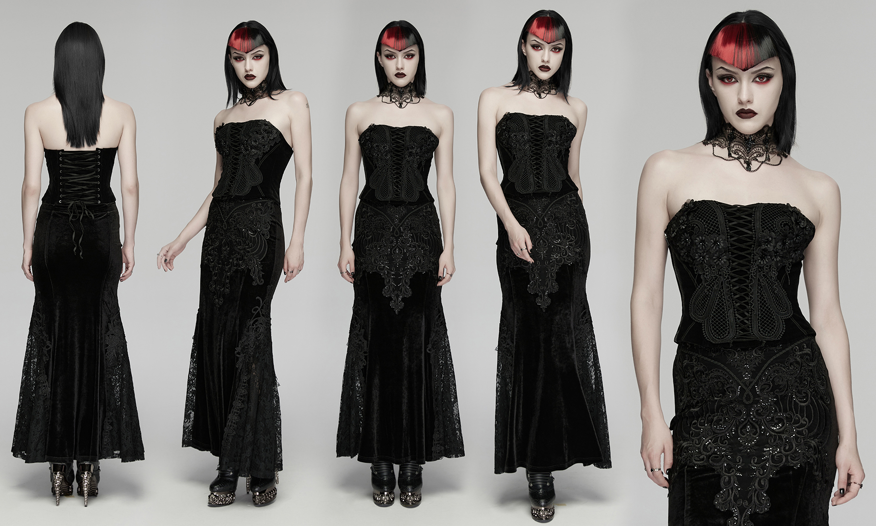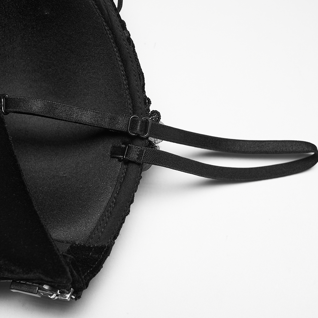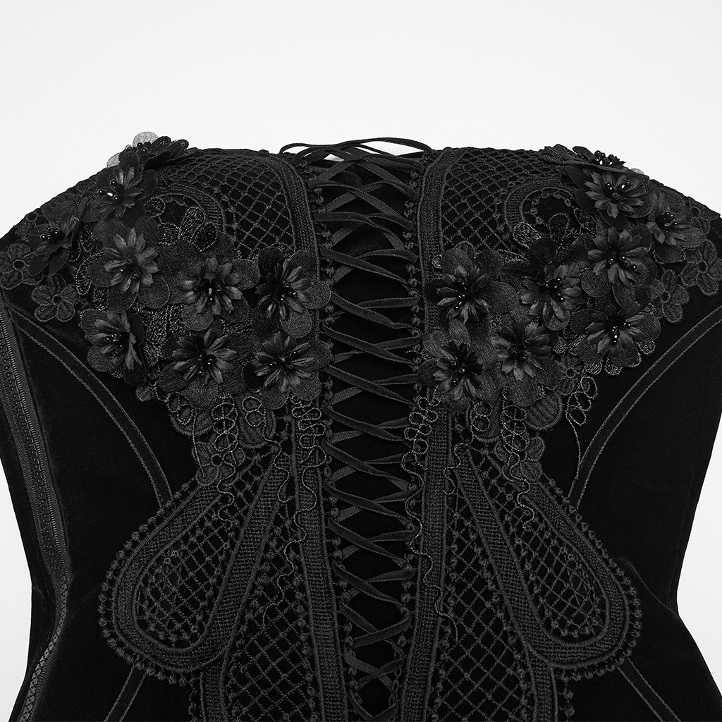 Mesh embroidery combined with 3d flowers, the softness of the flowers collides with Gothic style, mysterious and elegant.