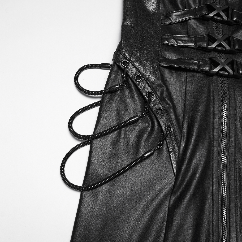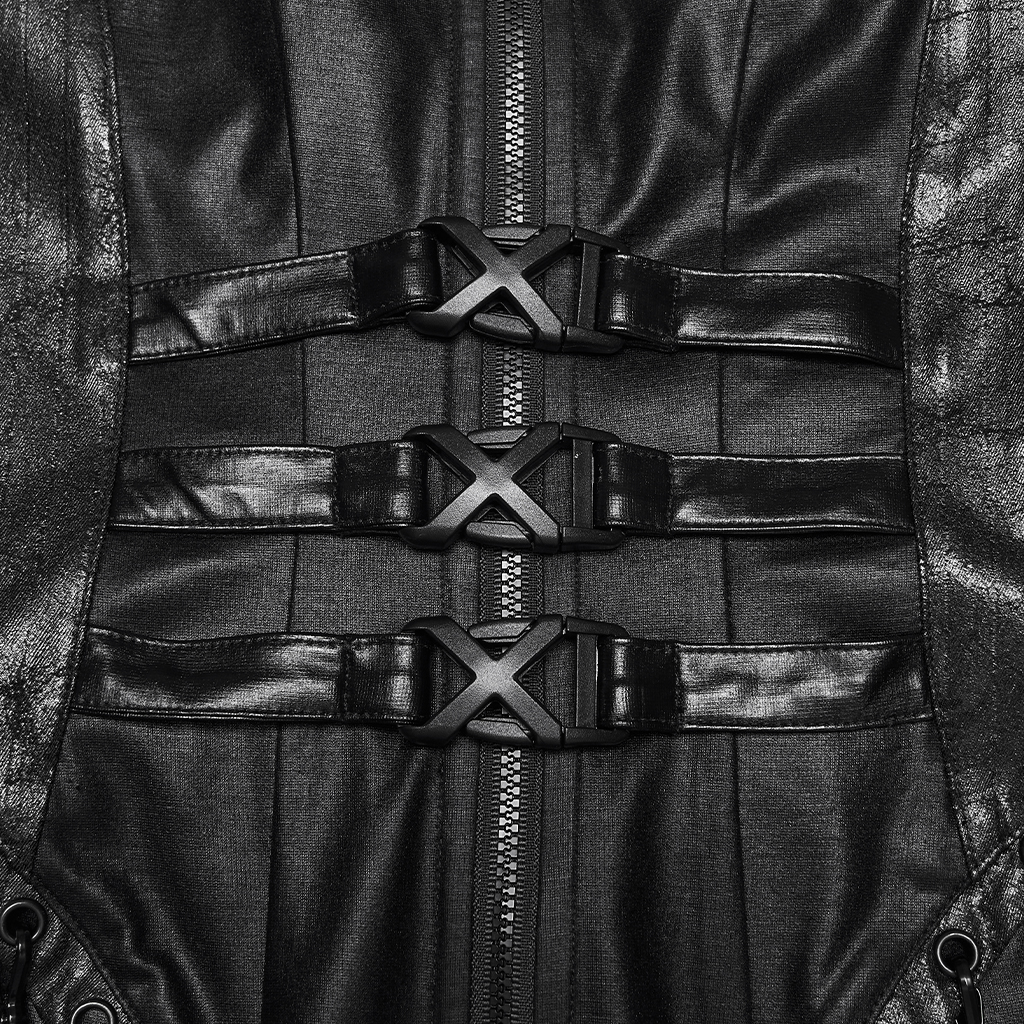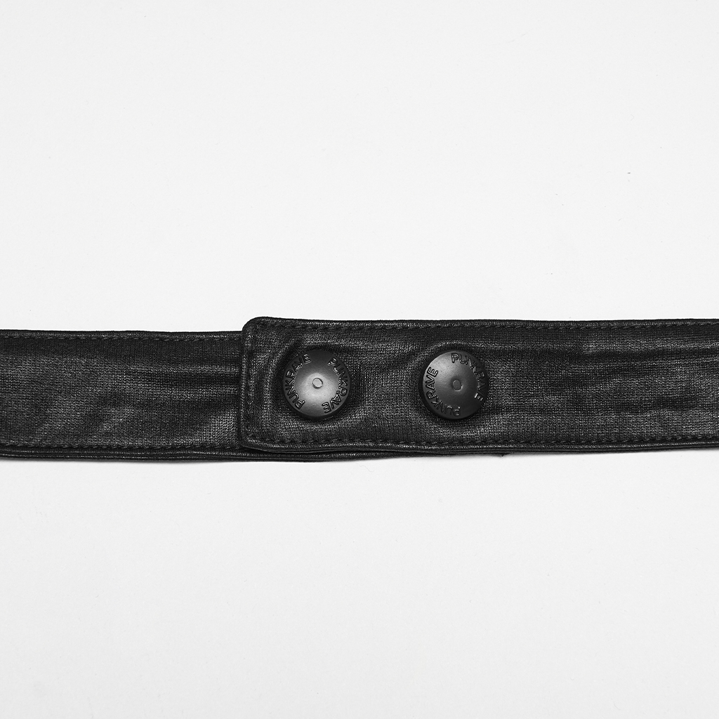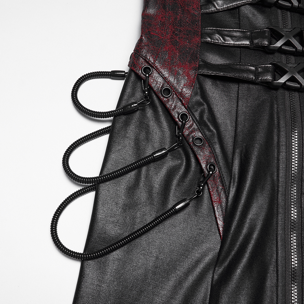 Made with elastic imitation leather, rubberized knit fabric, and cracked woven fabric.