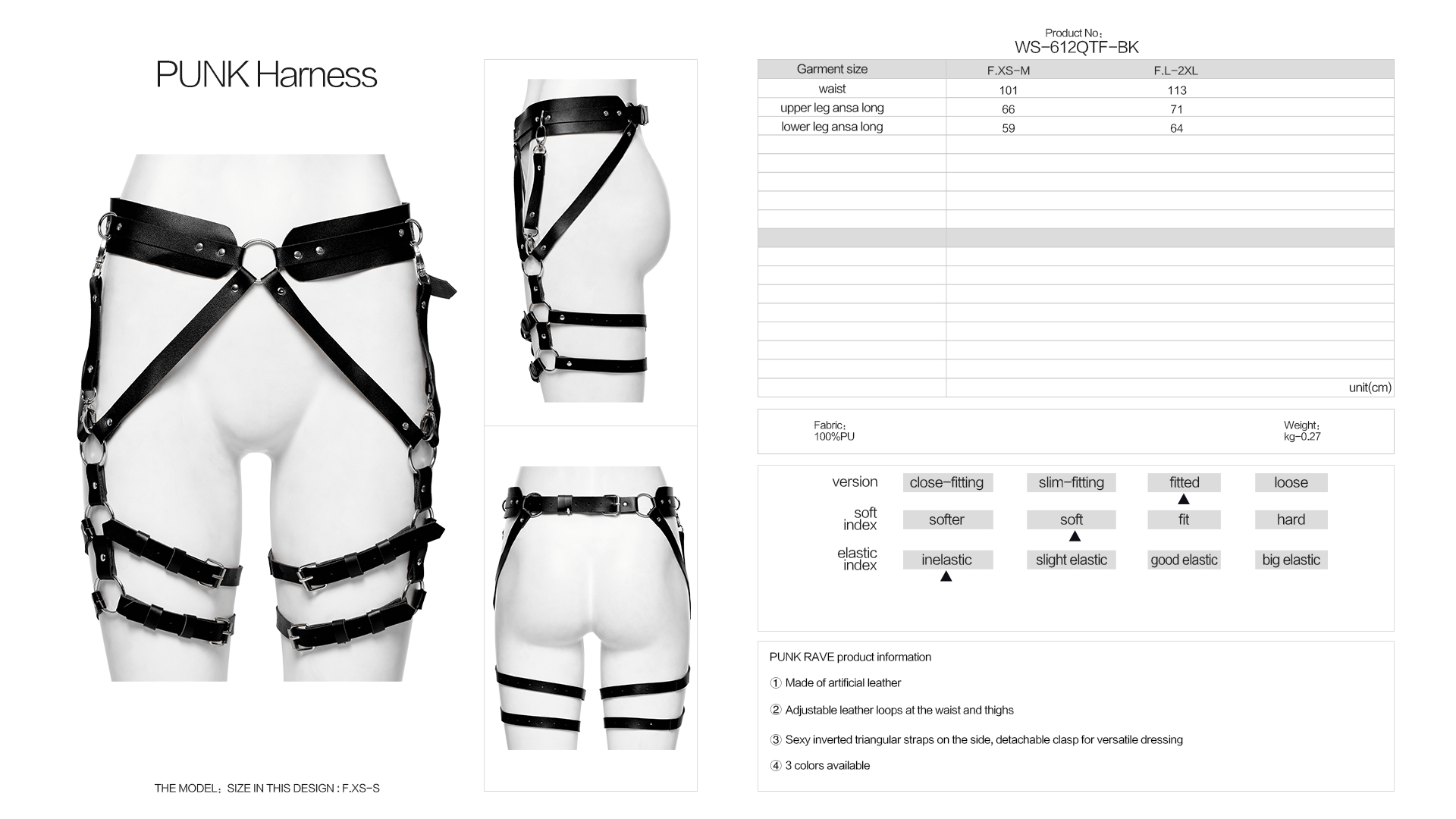 Adjustable leather loops at the waist and thighs.