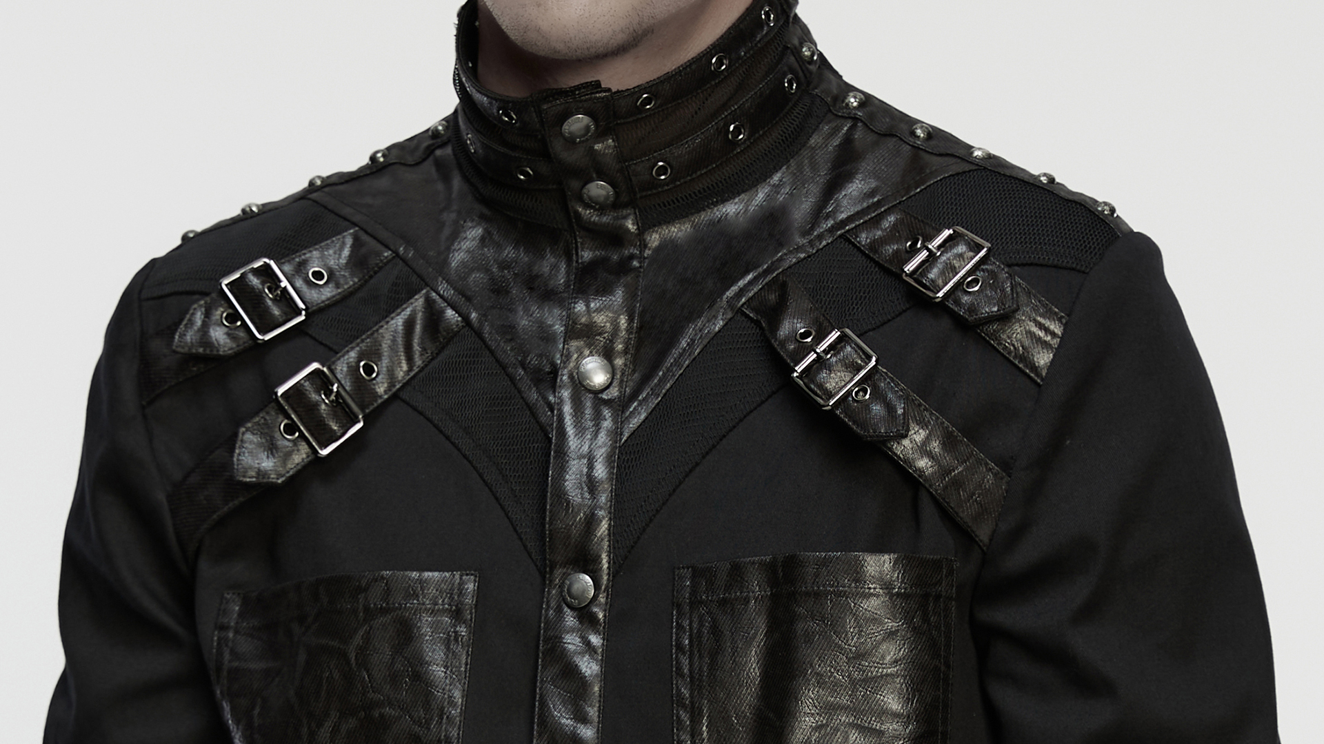 Shoulder rivets interpret cyberpunk style.