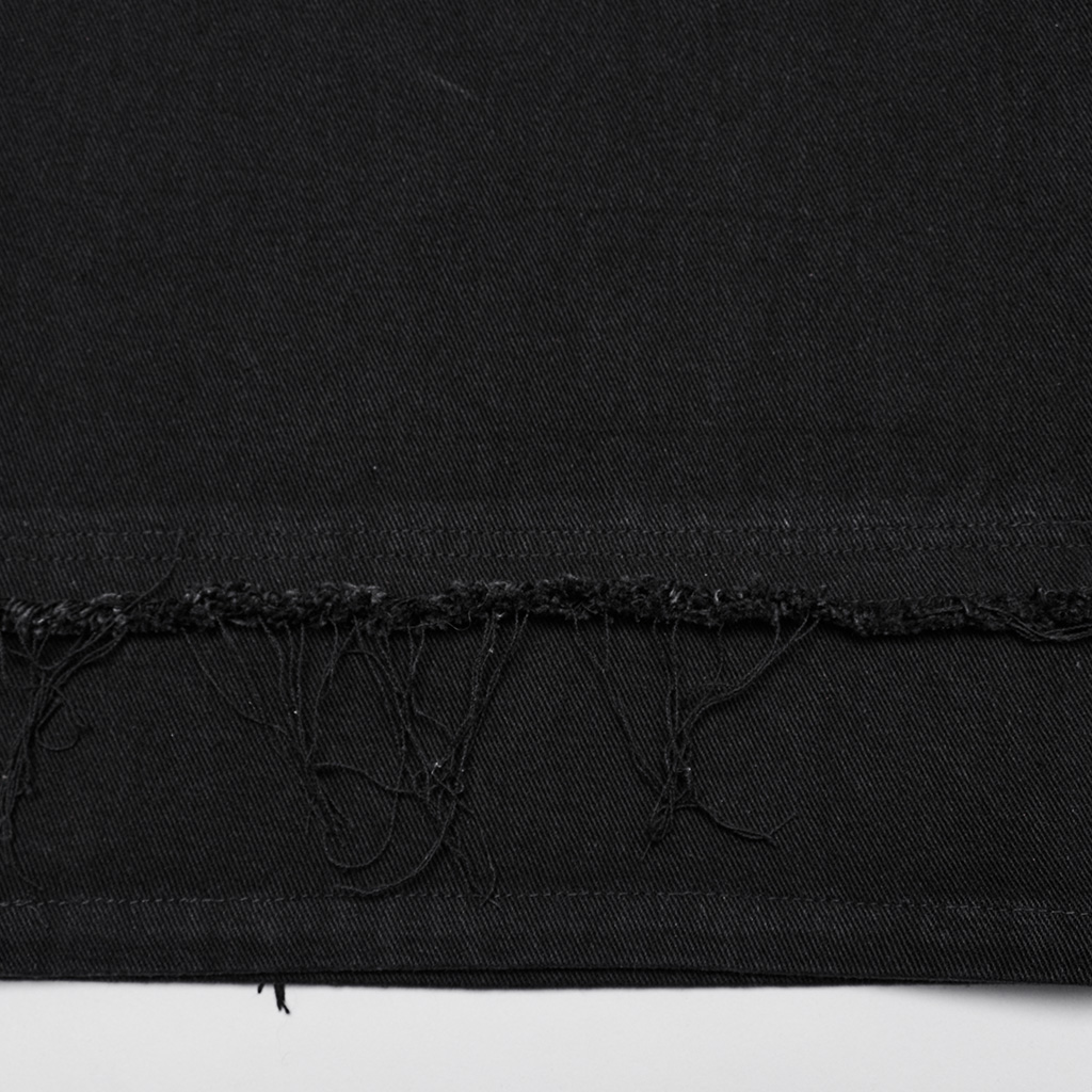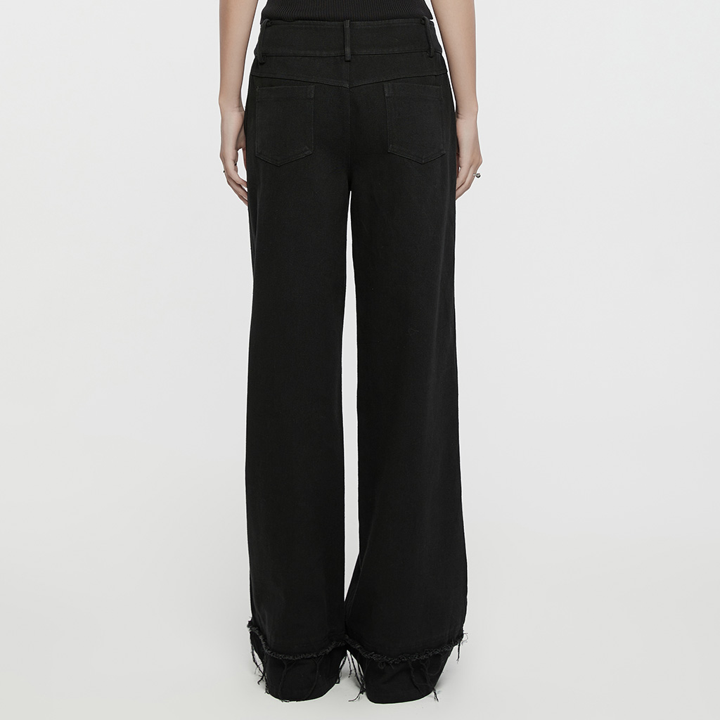 The raw edges of the pants legs adds a casual temperament, showcasing a strong retro feeling.