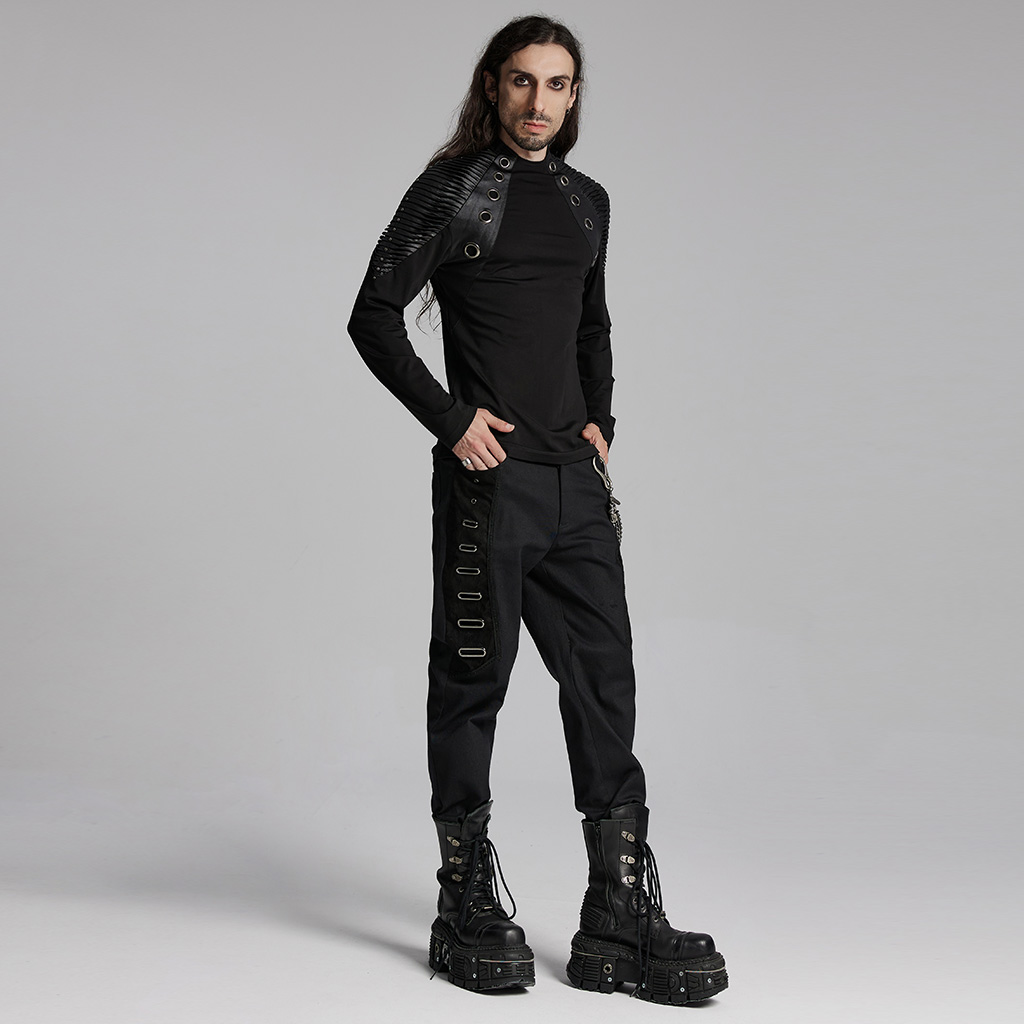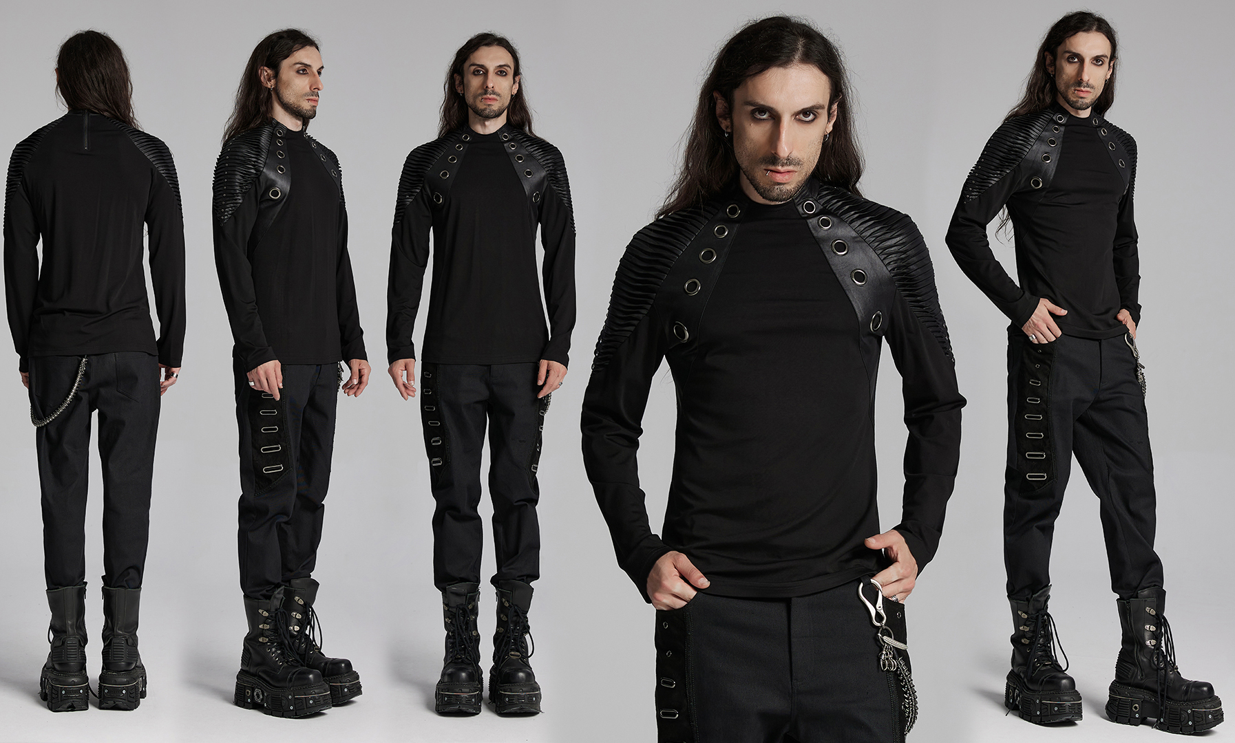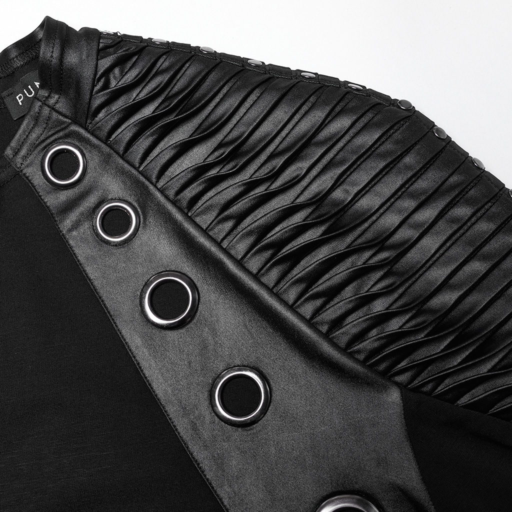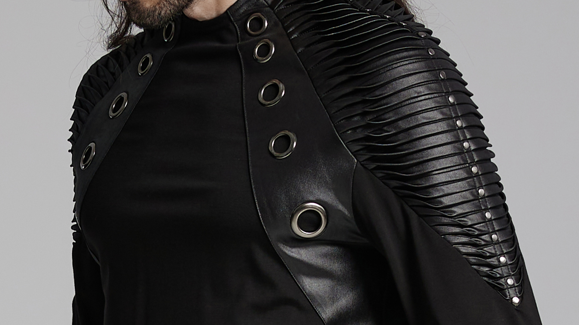 Shoulder 3D pleating and personalized rivets highlight male strength.